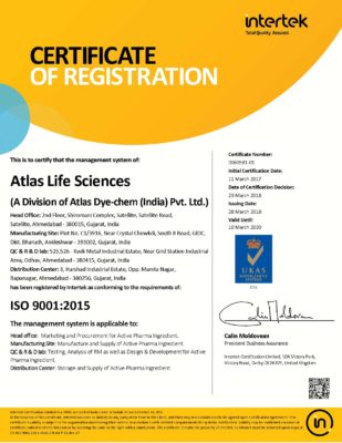 1st recipient of ISO 9002 Certification in Dyestuff Industries of Asia in the year 1993 which has been eventually upgraded to ISO 9001:2015 for API