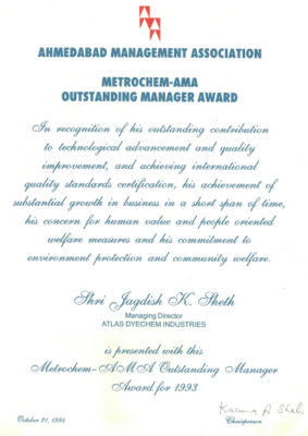 For the Year 1993 by Ahmedabad Management Association (AMA)  Founder Director of Atlas has been awarded as an Outstanding Manager.