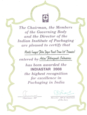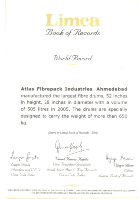 In its pursuit of excellence, Atlas has developed Fibre Drum, having 52” in height & 28” diameter with a volume of 505 liters, in 2005. This drum can take the weight load up to 650 kilos. It is a matter of great pride for us that this drum had been qualified as World’s Largest Fibre Board Drum by Limca Book of Records in 2006.